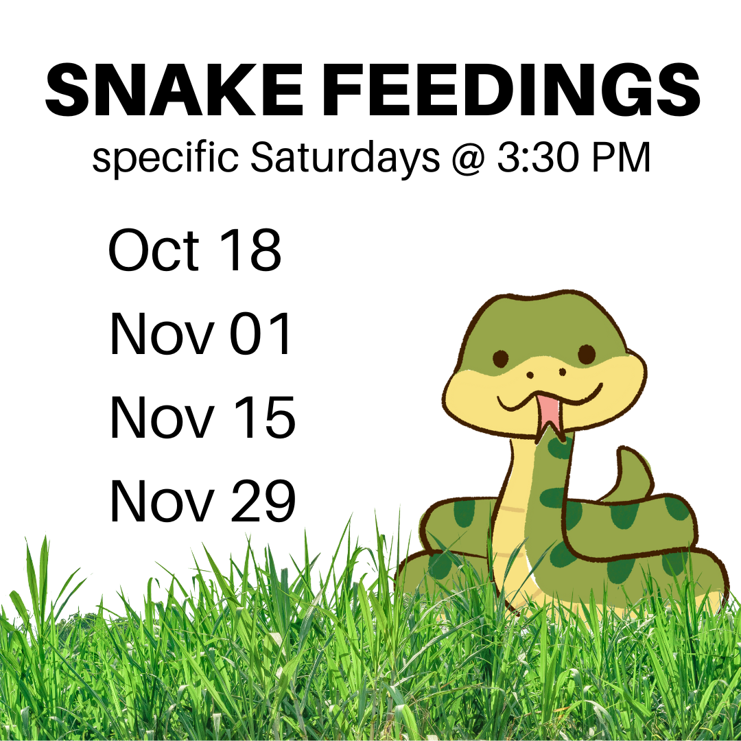 It takes our snakes two weeks to digest their lunch. If you want to be at HSC when we feed our snakes, watch the calendar and join us on the specific Saturday listed. Feedings take place at 3:30 PM. Don't be late!