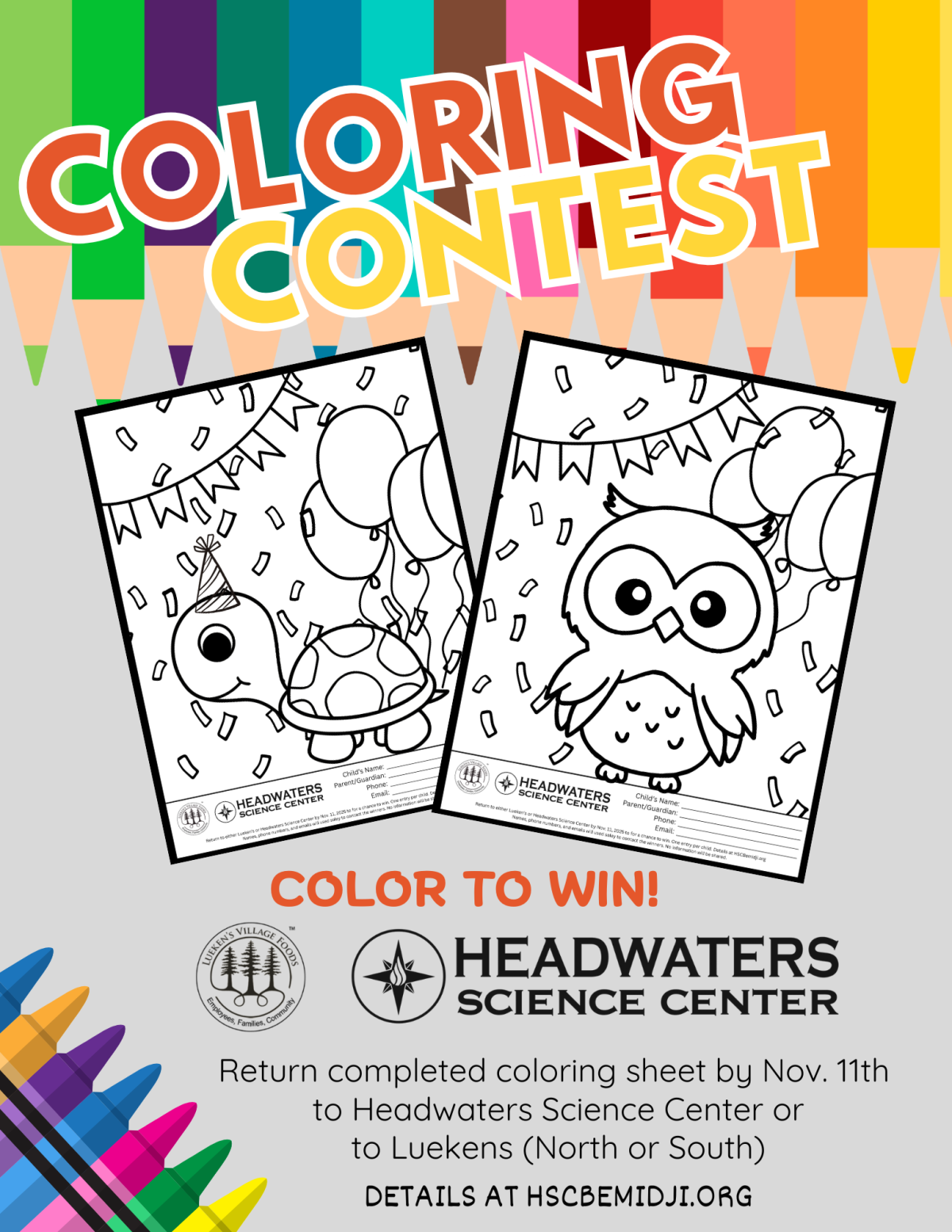 Download and print coloring sheet (click on image at right) - or pick up coloring sheet at Headwaters Science Center or Lueken's (North or South) - and return to HSC or either Lueken's North or South.